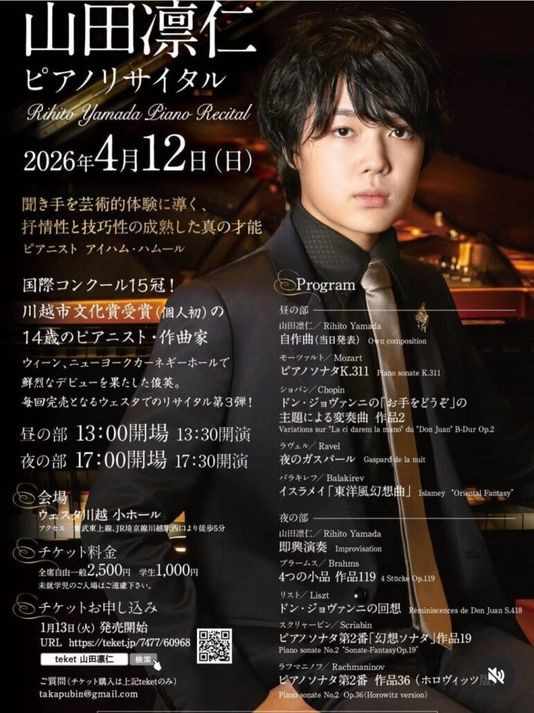 山田 凛仁(Rihito Ymada)さんのピアノリサイタルがあります🎹🎵